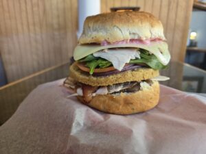 Harvest Club – double portion of house-smoked turkey breast, bacon, Swiss cheese, homemade apple butter & cranberry mayo, spinach, tomato & red onion. Served on our house-made Stuffing bread (eggs, parsley, sage, rosemary, thyme, garlic) w/ a sweet potato bread center. It’s Thanksgiving dinner all in one sandwich!